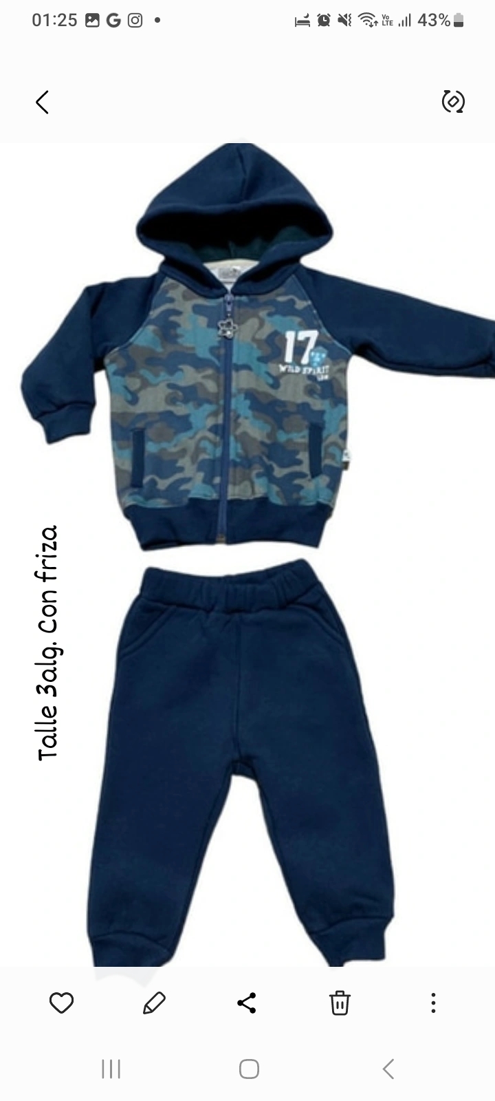 Conjunto de algodon y frisa, campera camuflada y pantalón liso